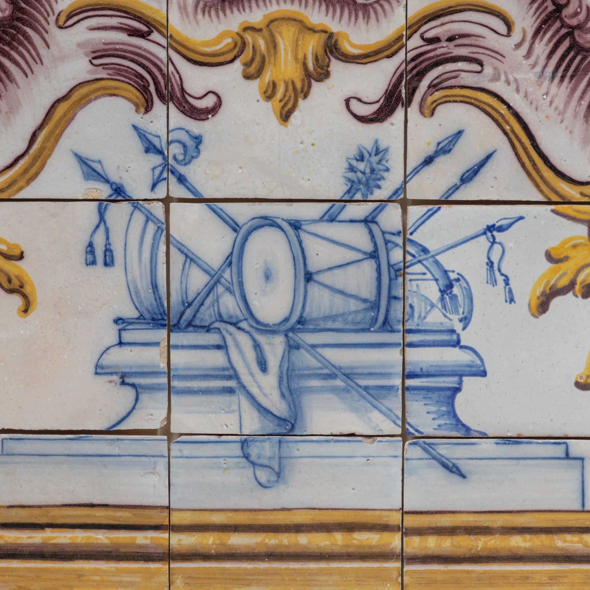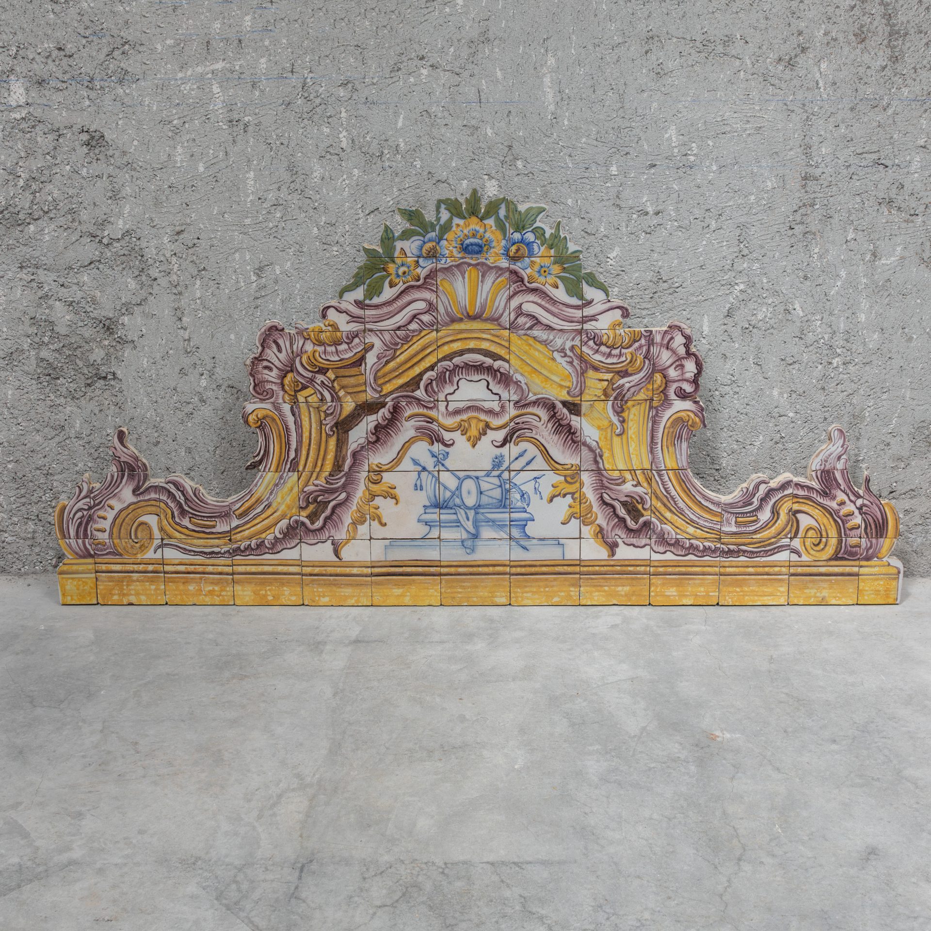 Top of altar frontal from 1720-1760 made up of cut-out tiles. The composition is dominated by symmetrical volutes, shells, windings, plant ornamentation and floral elements. At the center is a symbolic motif in blue on a white background, framed by an architectural frame painted in yellow, manganese, blue and green, typical colors of Portuguese eighteenth-century production. The design reveals the influence of gilded woodcarving and the ephemeral architecture of the time, suggesting its original use as the top edge of a mural panel, possibly in a church, palace or manor house.