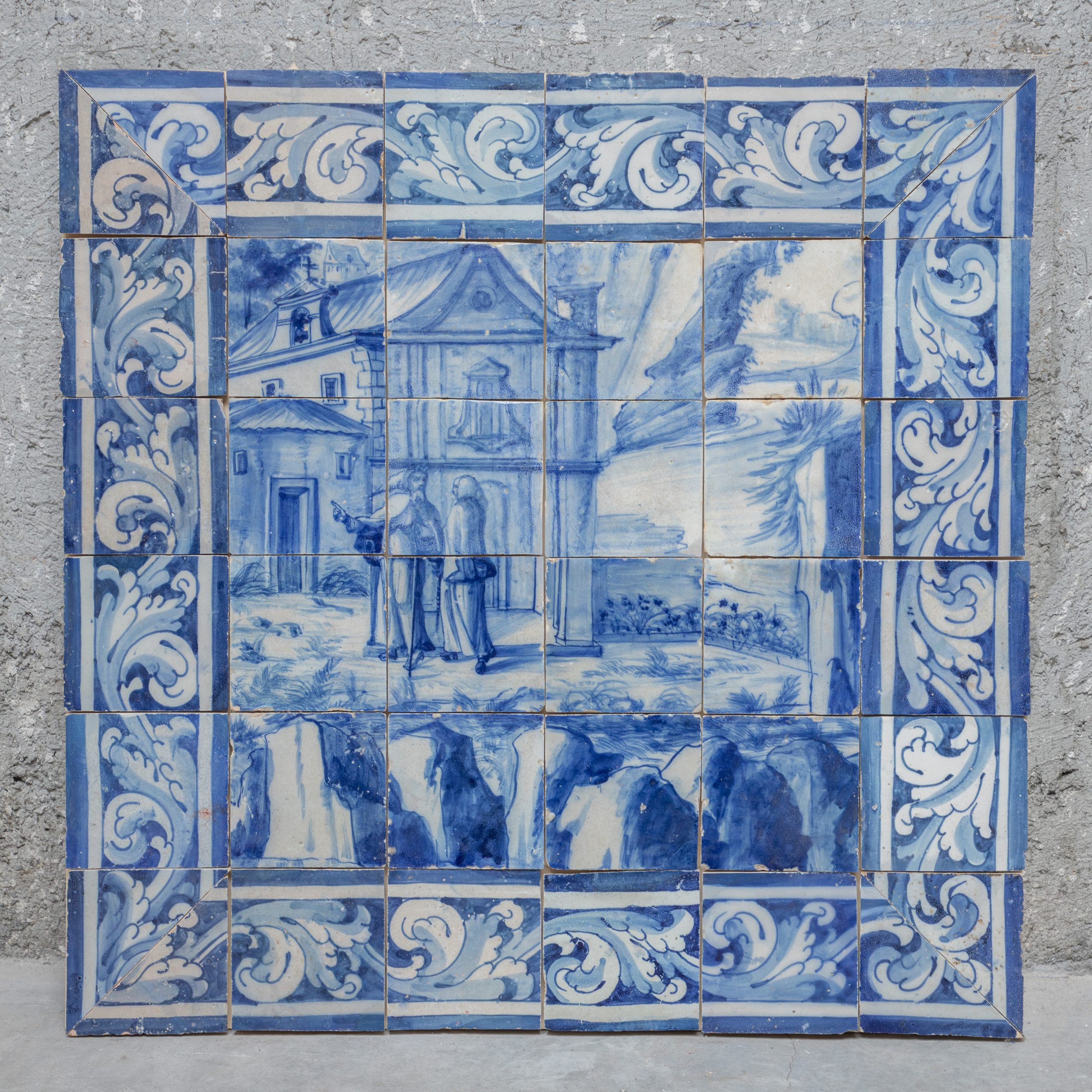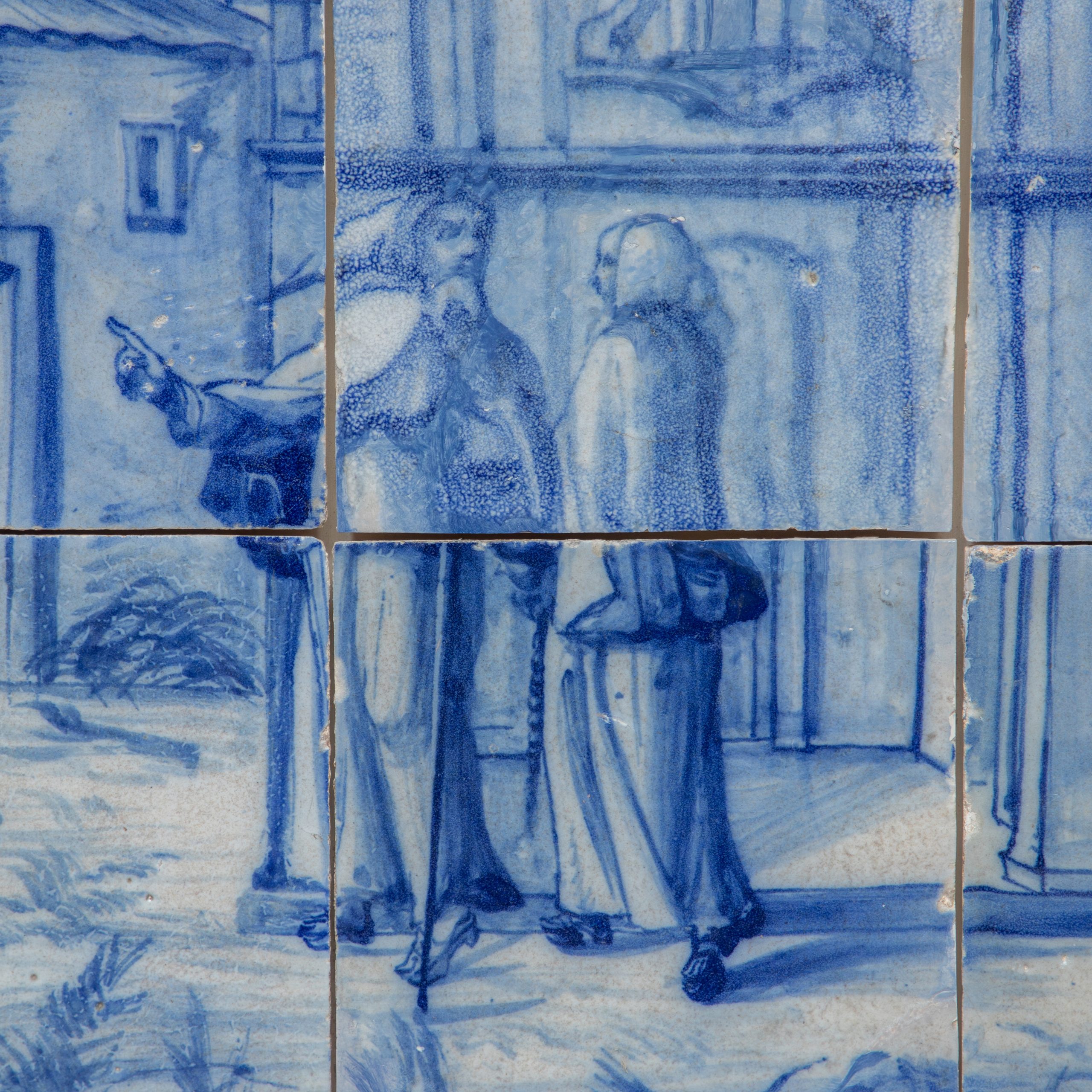Figurative panel from the 18th century in blue and white depicting an architectural scene with figures in the foreground in front of religious buildings.