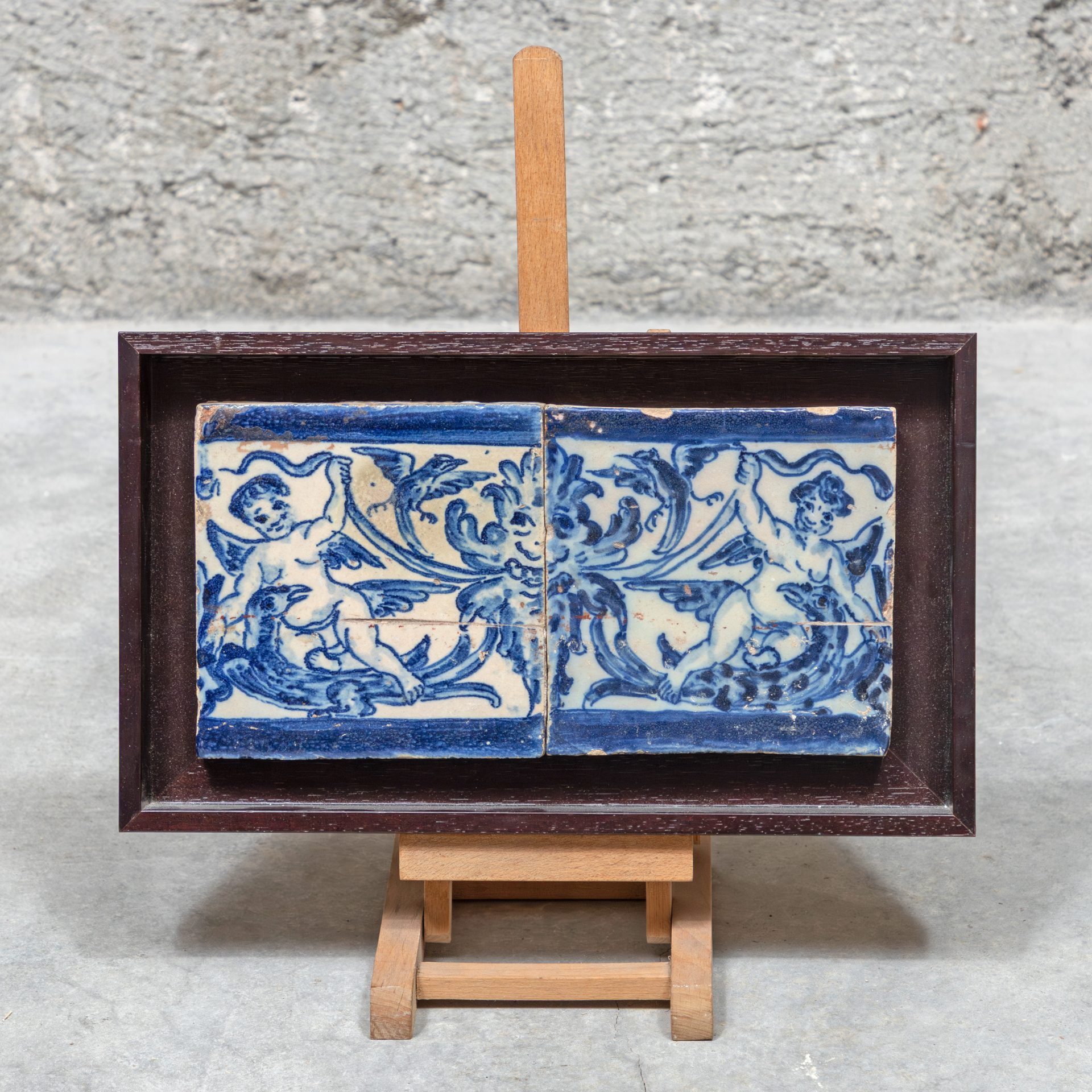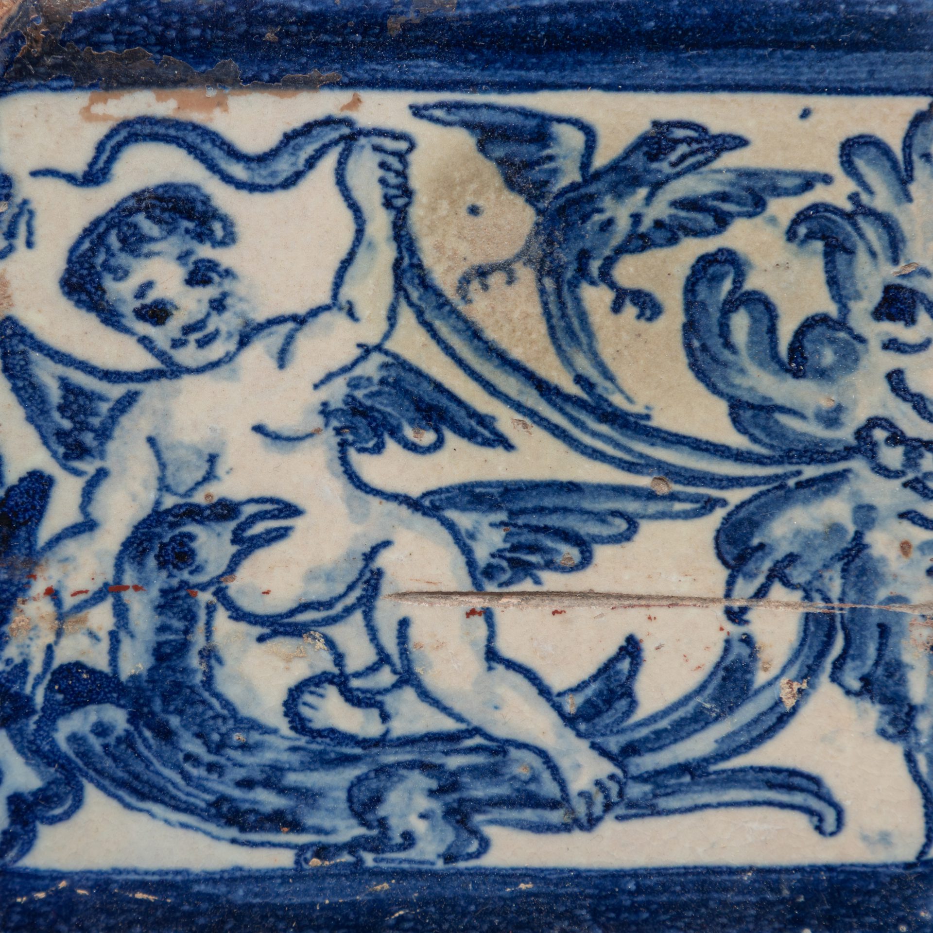 Composition of 17th century tiles in blue and white, with the motif of the Leaf Man, where the human figure merges with plant elements.