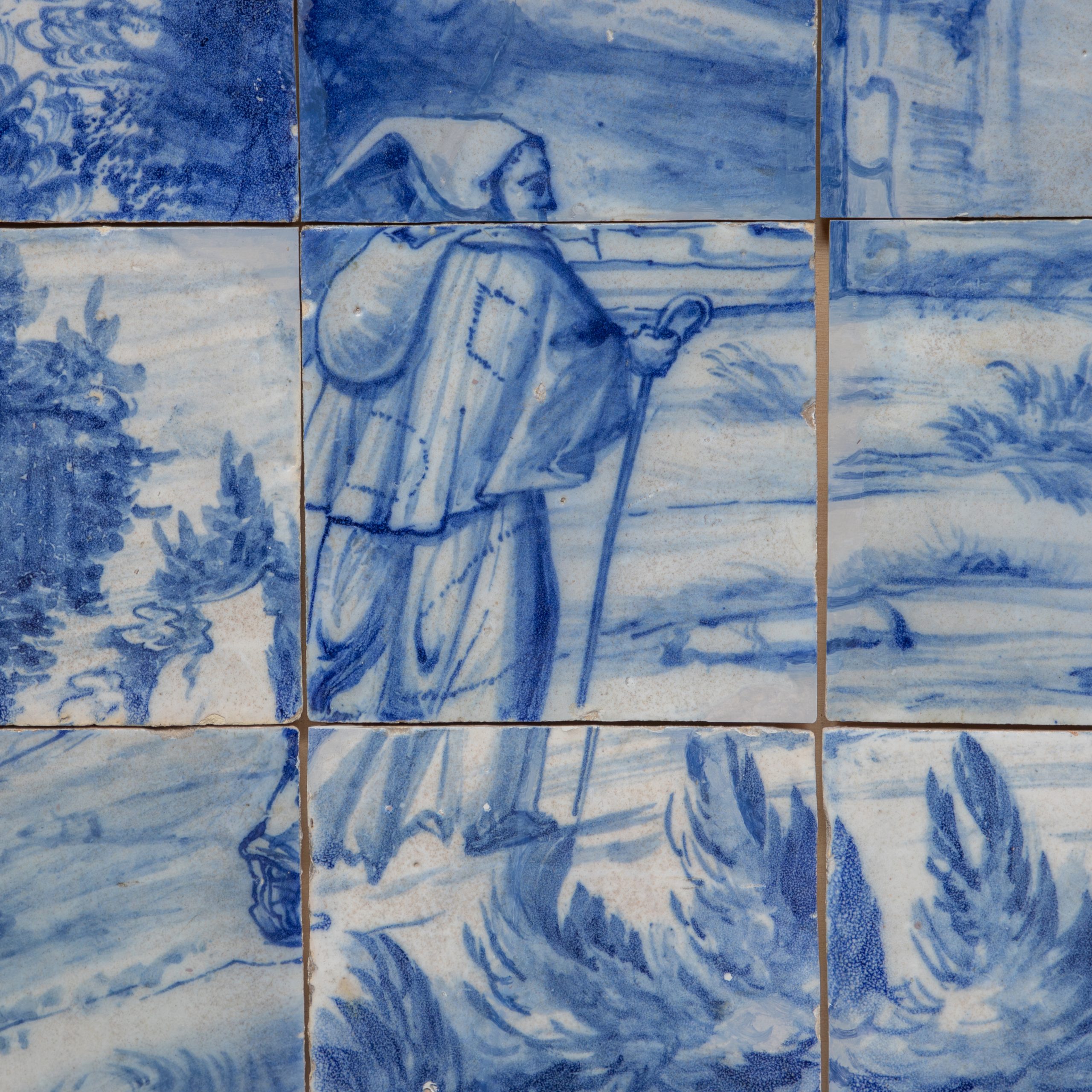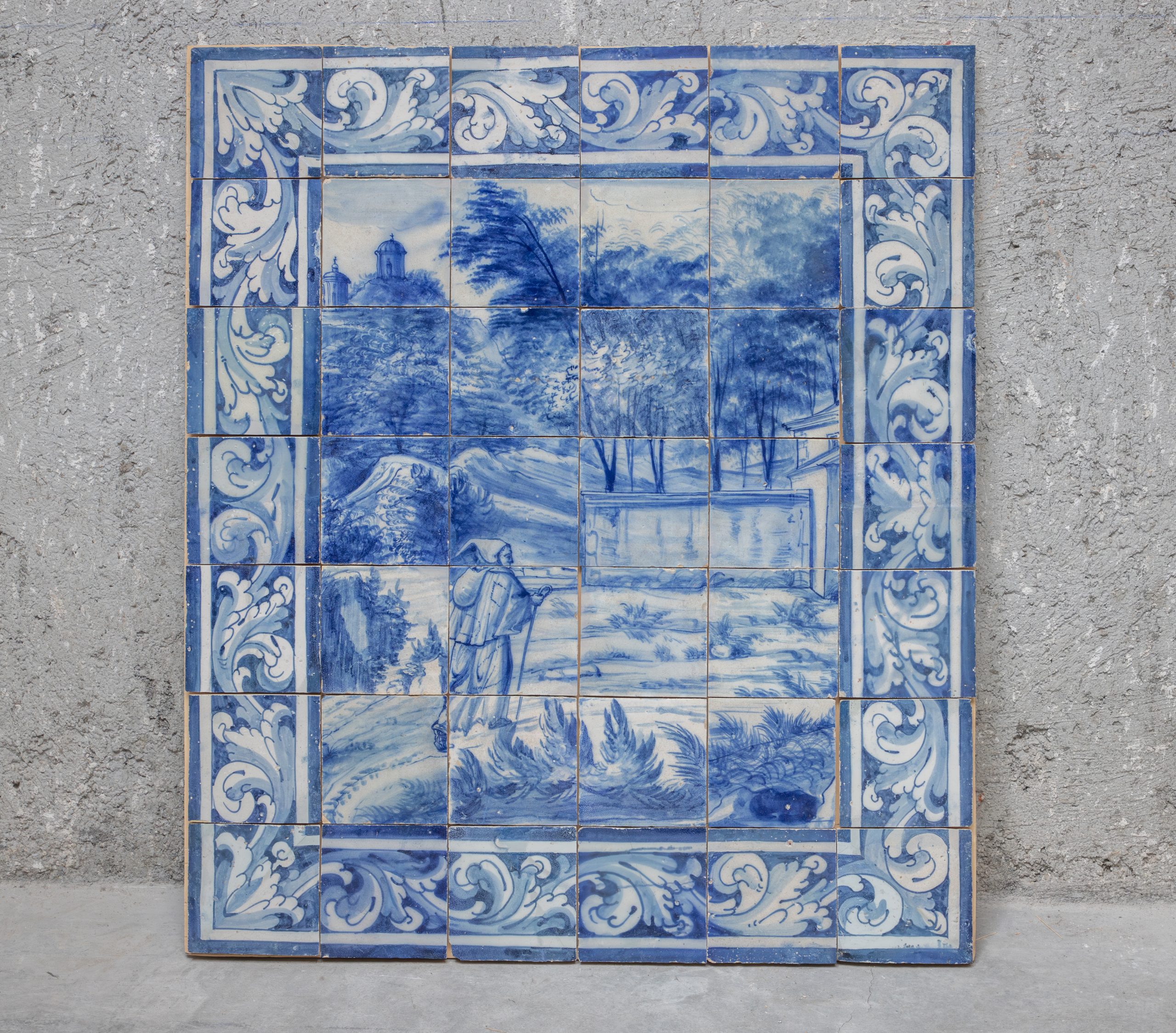 An 18th-century figurative panel in blue on white depicting a monk with a staff, set in a natural landscape with architectural elements.