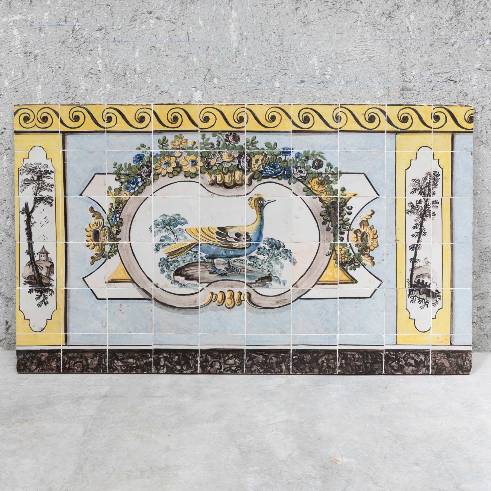 Tile panel depicting a bird, perhaps a pheasant, decorated with a garland of flowers in shades of green, blue and yellow, topped on the sides with two small Asian-inspired manganese panels.