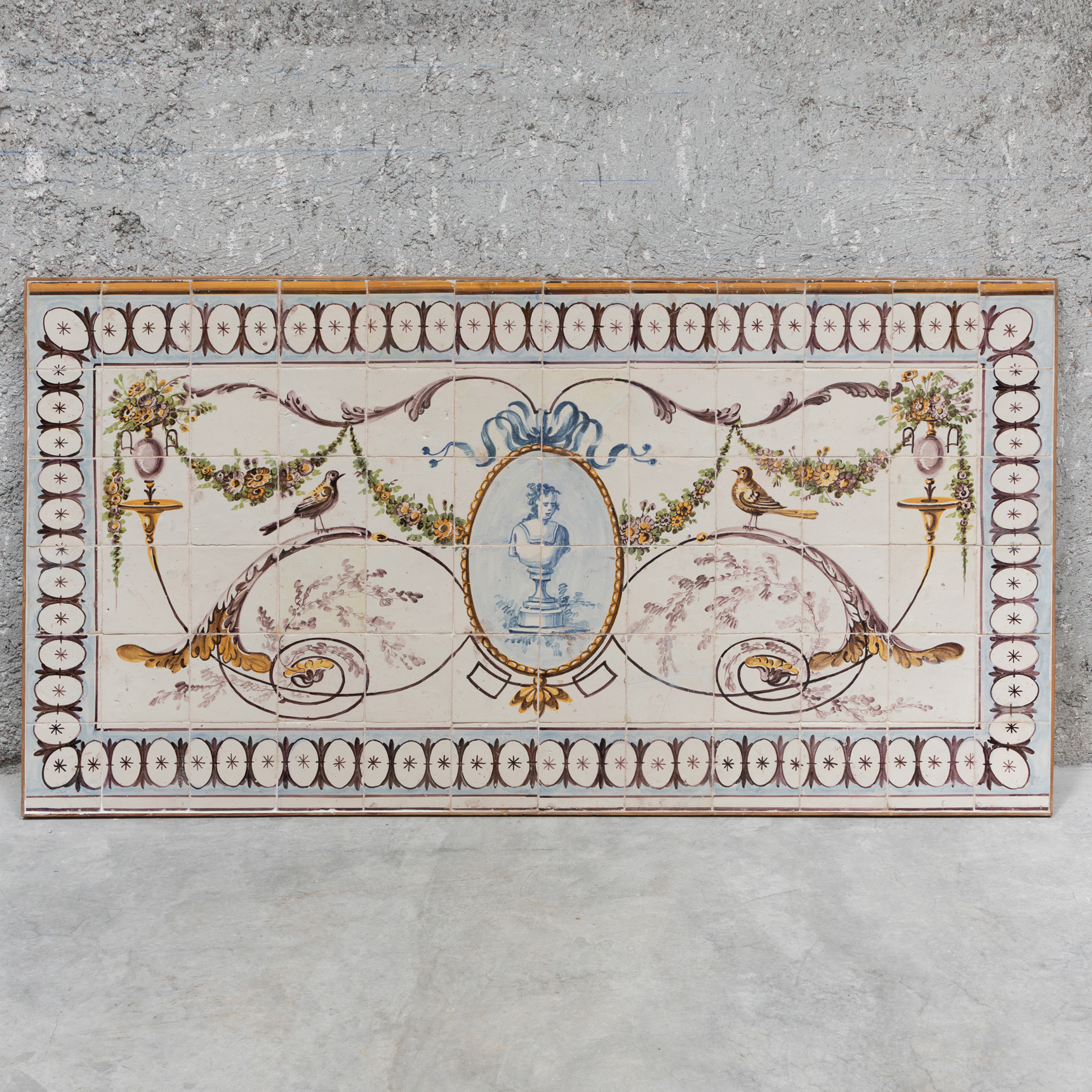 Neoclassical panel, second half of the 18th century, with a female bust in the center, with birds and flower vases in shades of blue, yellow and manganese.
