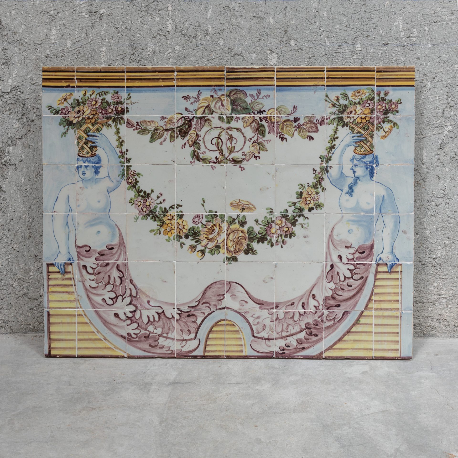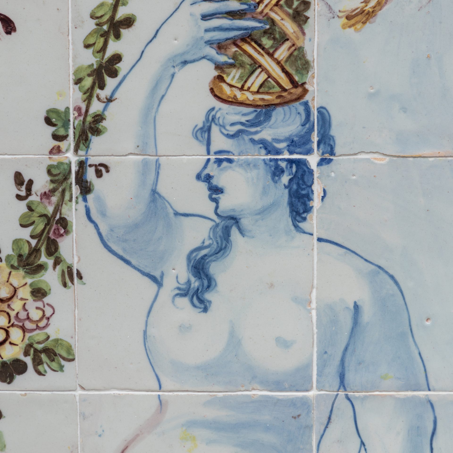 Polychrome tile panel with two symmetrical female figures holding baskets of flowers. The decorative composition combines floral and architectural elements.