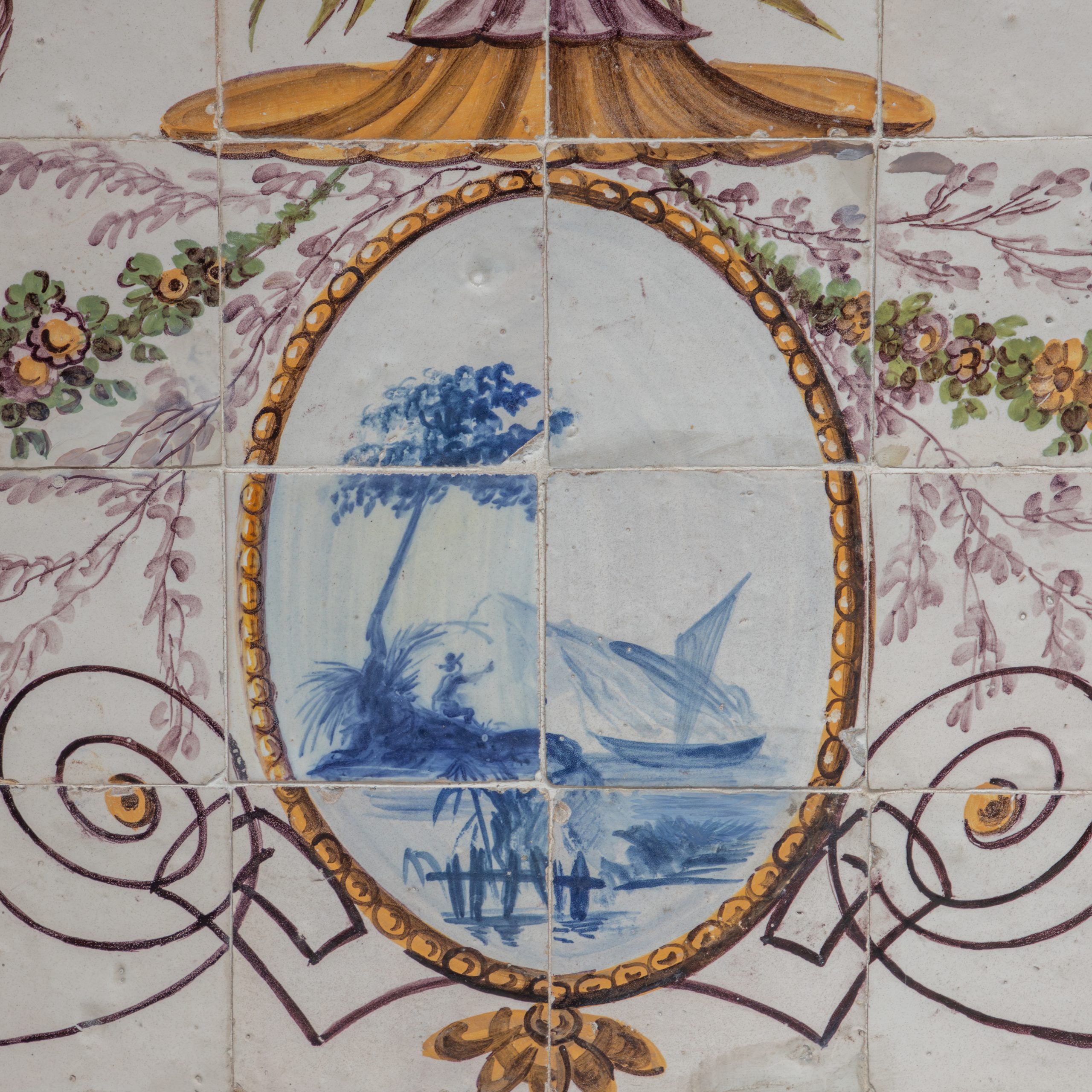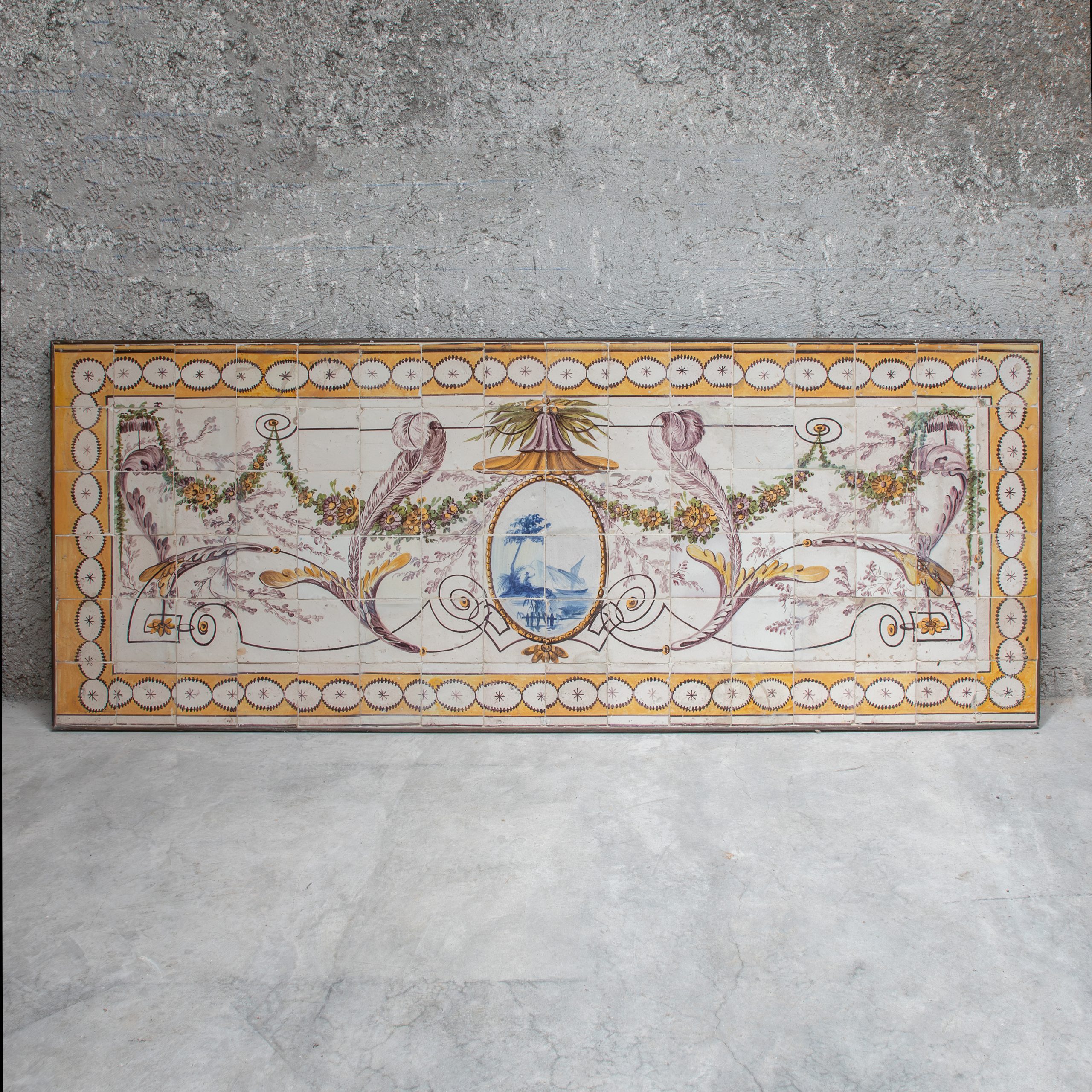 A panel of Portuguese tiles from the 18th century, neoclassical production, with a yellow border. In the center is a cartouche with a maritime scene in blue, surrounded by decorative floral and shell elements.
