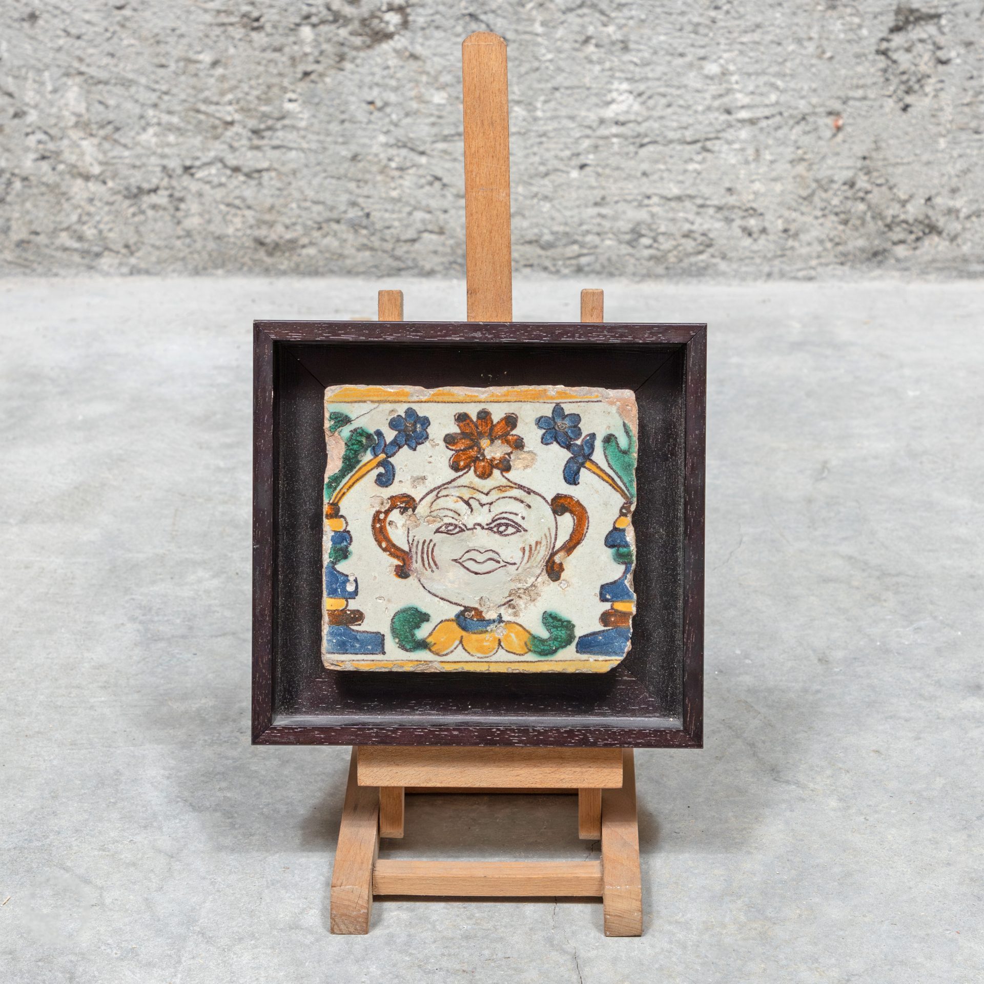Spanish figurative tile from the 17th century. The piece features a central vase with an anthropomorphic face, surrounded by stylized floral motifs in shades of blue, green and yellow.
