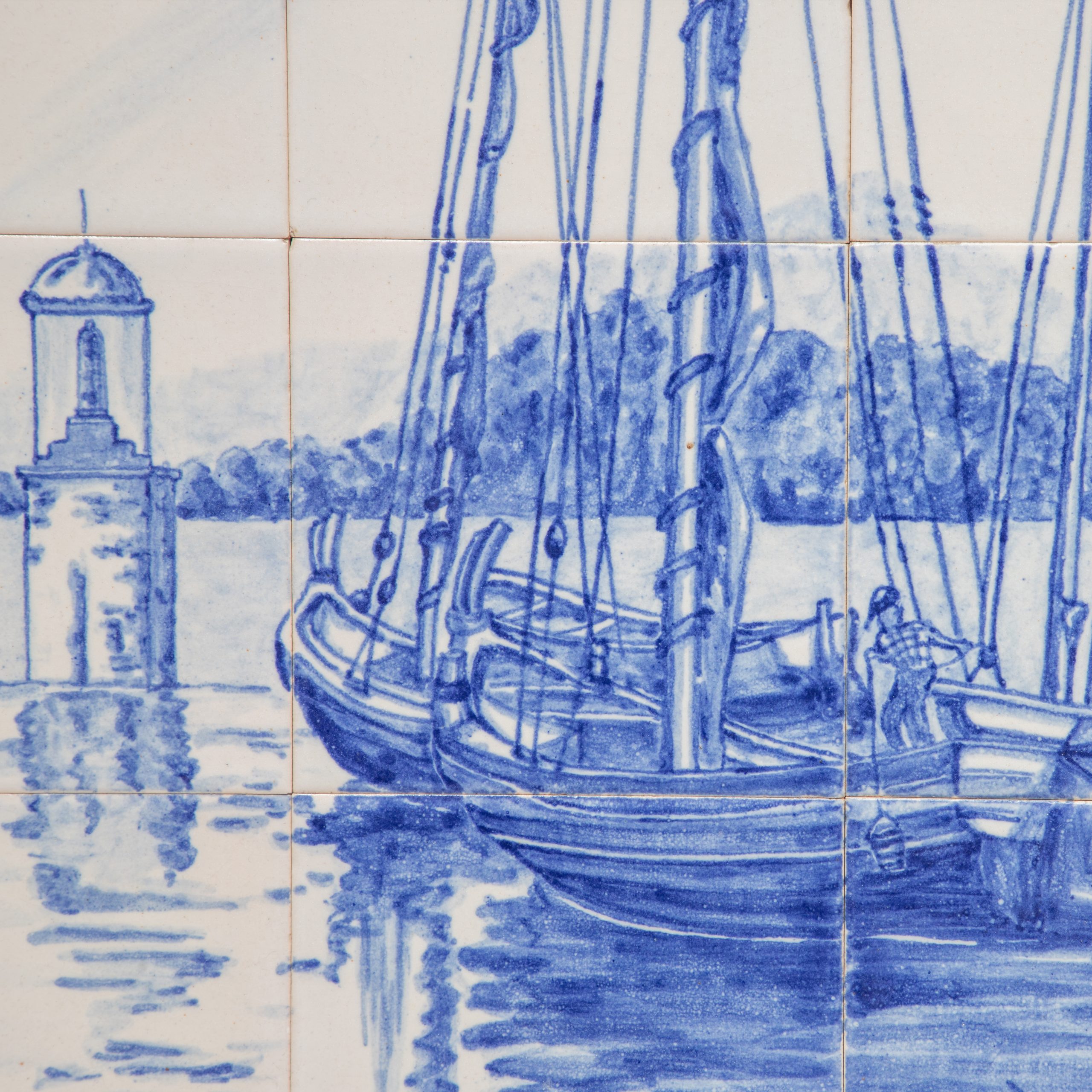 Panel of Portuguese blue and white tiles depicting traditional boats in a riverside scene, with a lighthouse in the background. The composition follows the naturalistic aesthetic of 20th century tiles and has a signature in the bottom right-hand corner.