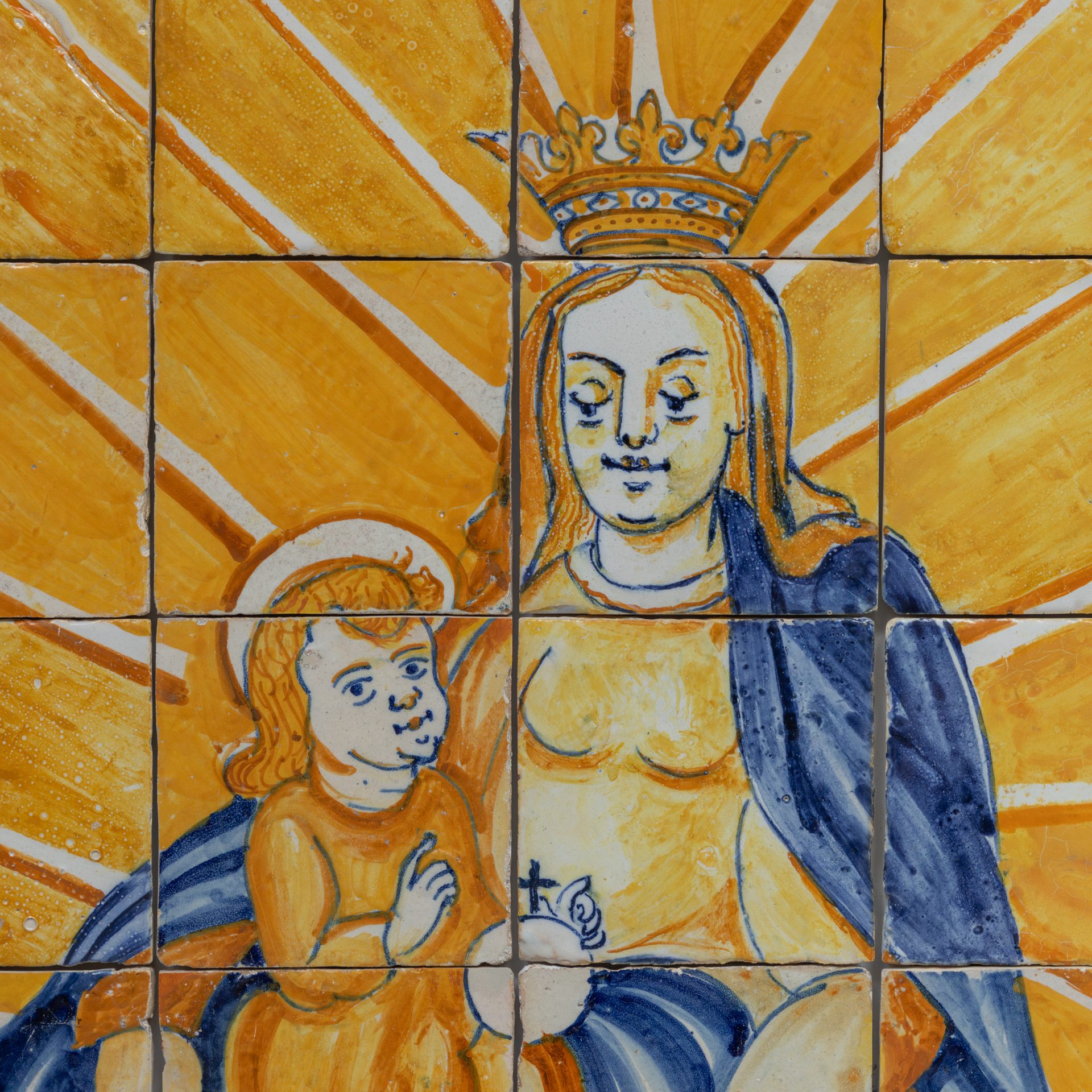 17th century tile panel depicting the Virgin Mary with baby Jesus on her lap.