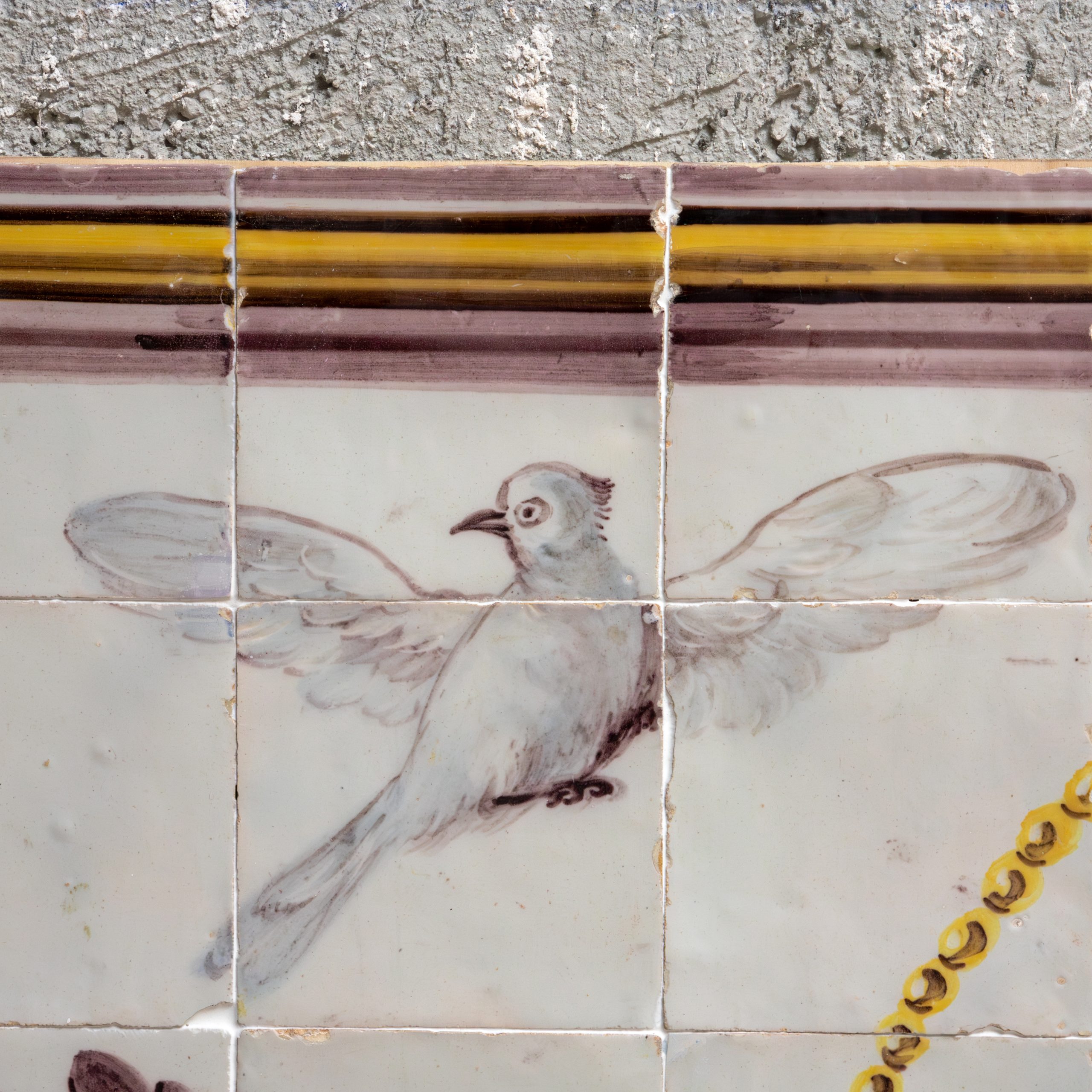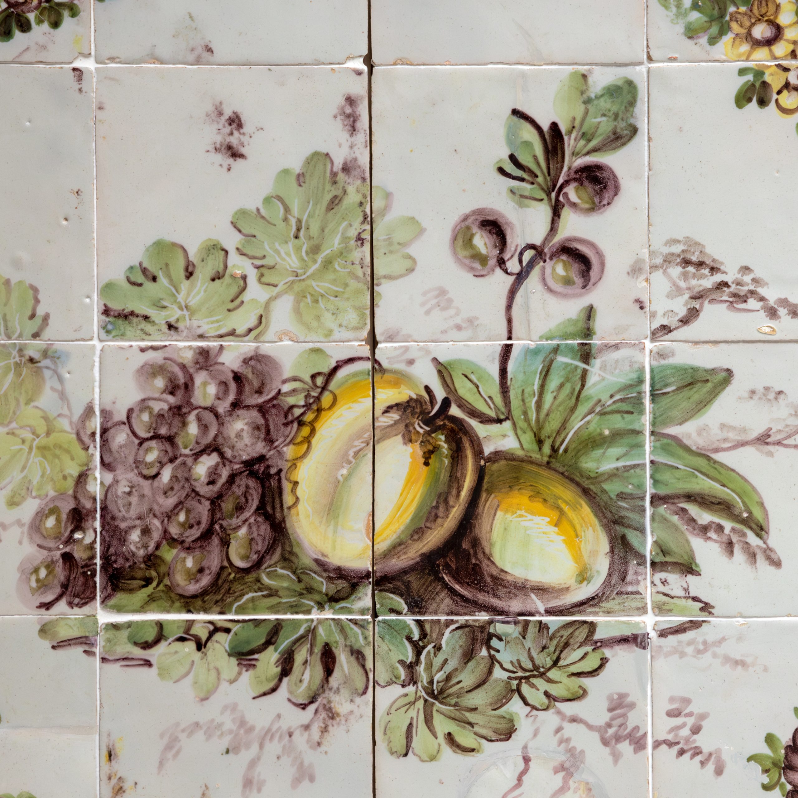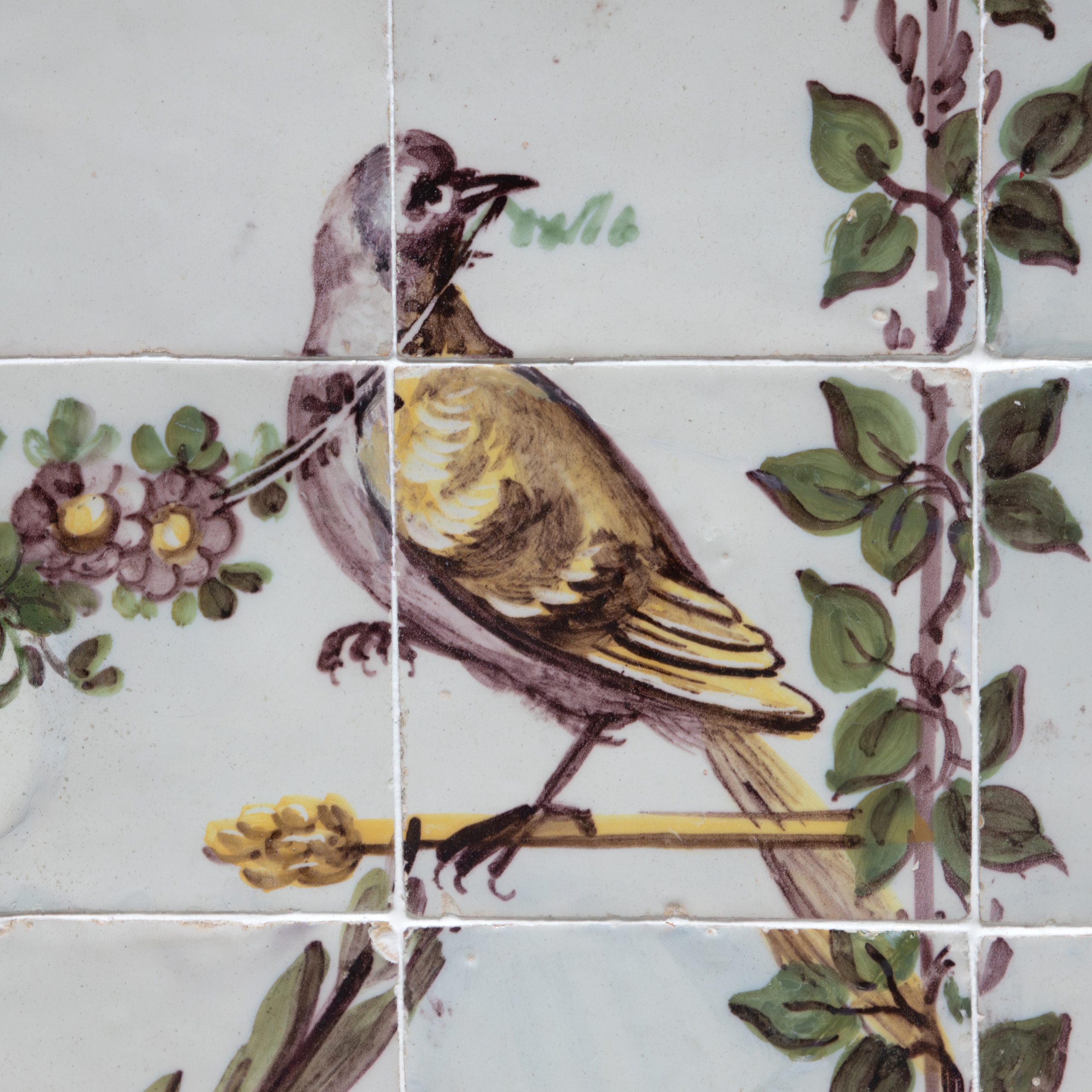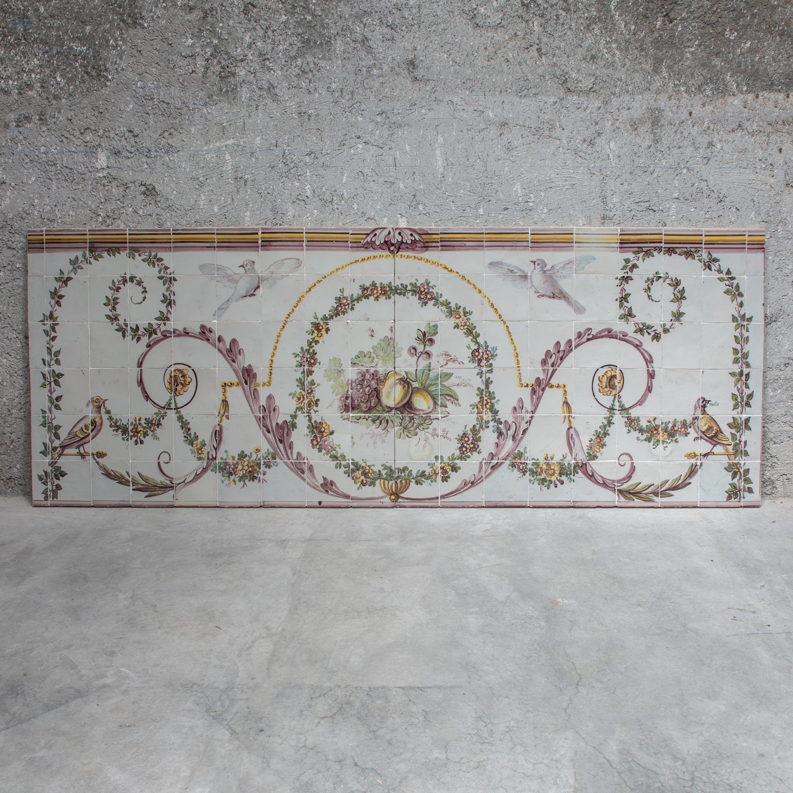 Neoclassical tile panel from the 18th century, decorated with floral garlands, birds and plant elements in soft tones. Symmetrical composition, centered with an arrangement of fruit.