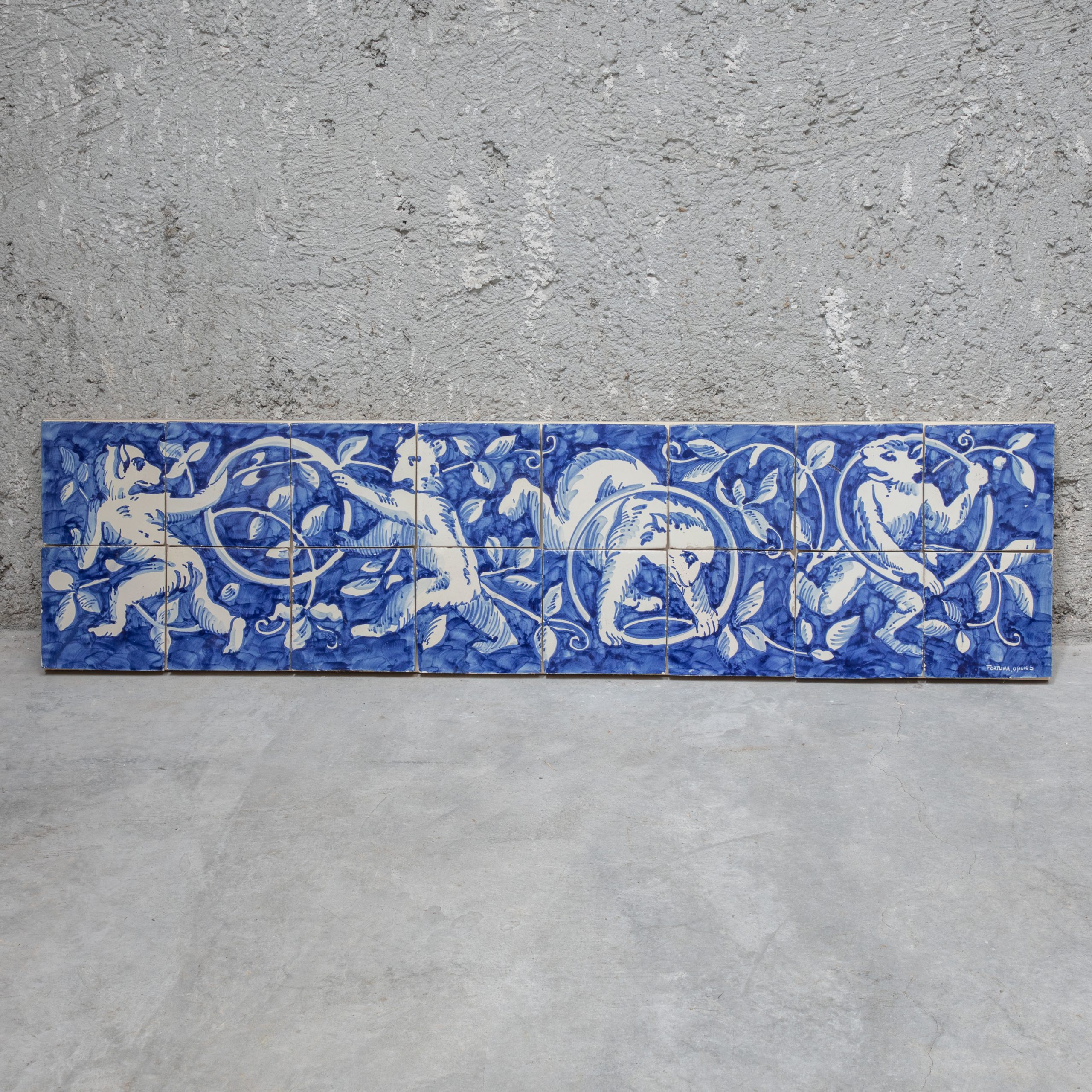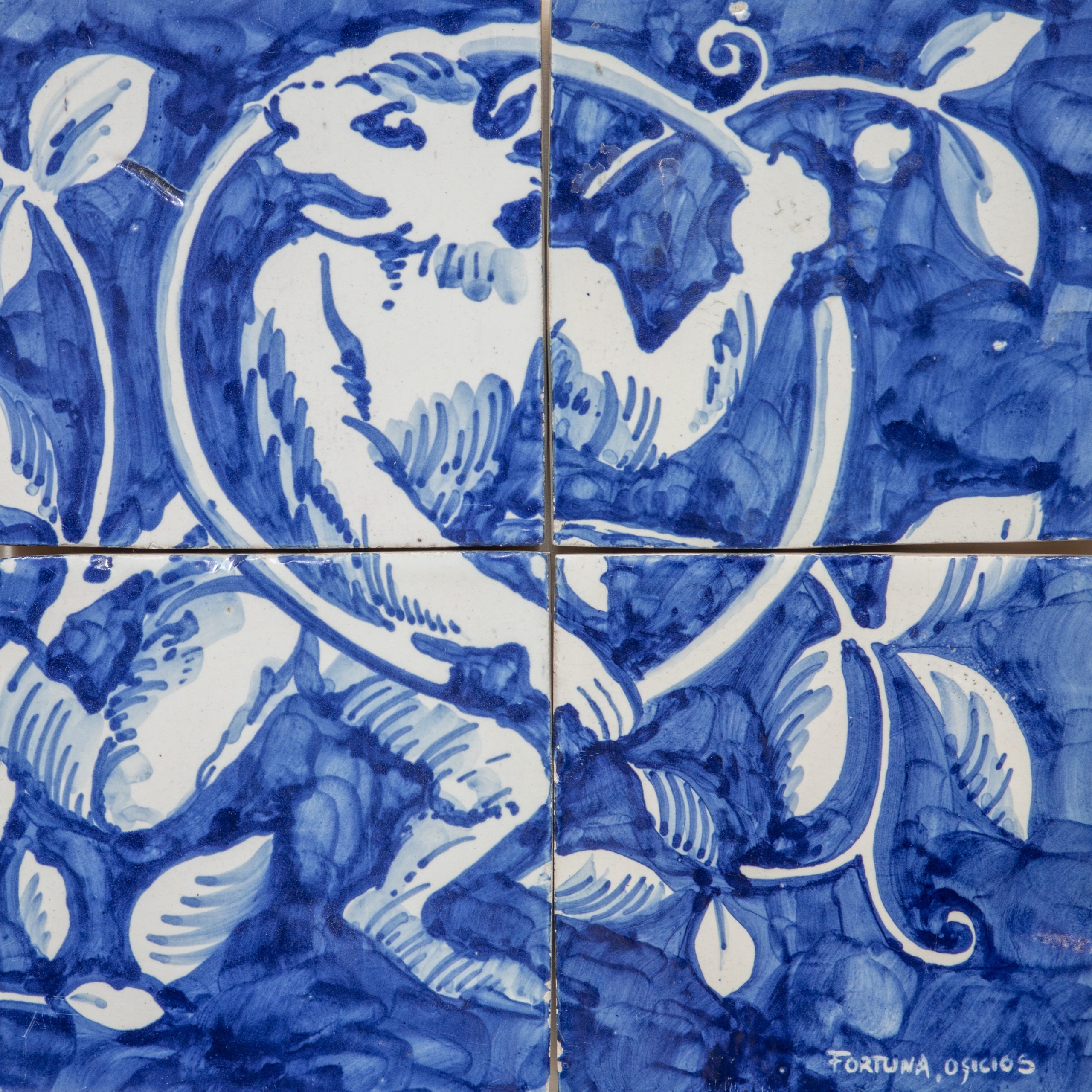 Composição de azulejos em azul e branco com assinatura "Fortuna, Oficios".