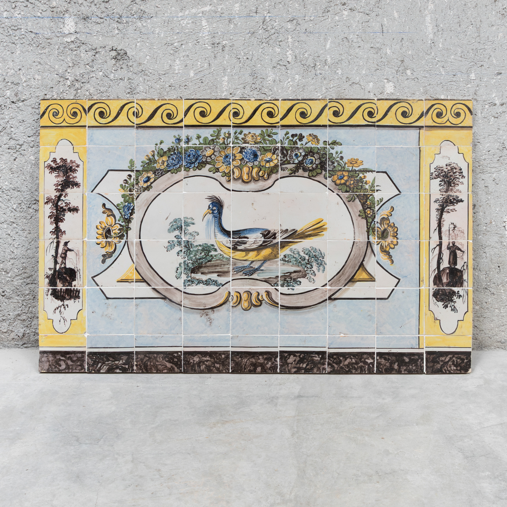 Painel de azulejos com representação de um pássaro, talvez um faisão, decorado com grinalda de flores em tons de verdes, azuis e amarelos, rematado nas laterais com dois pequenos painéis em manganês de inspiração asiática.