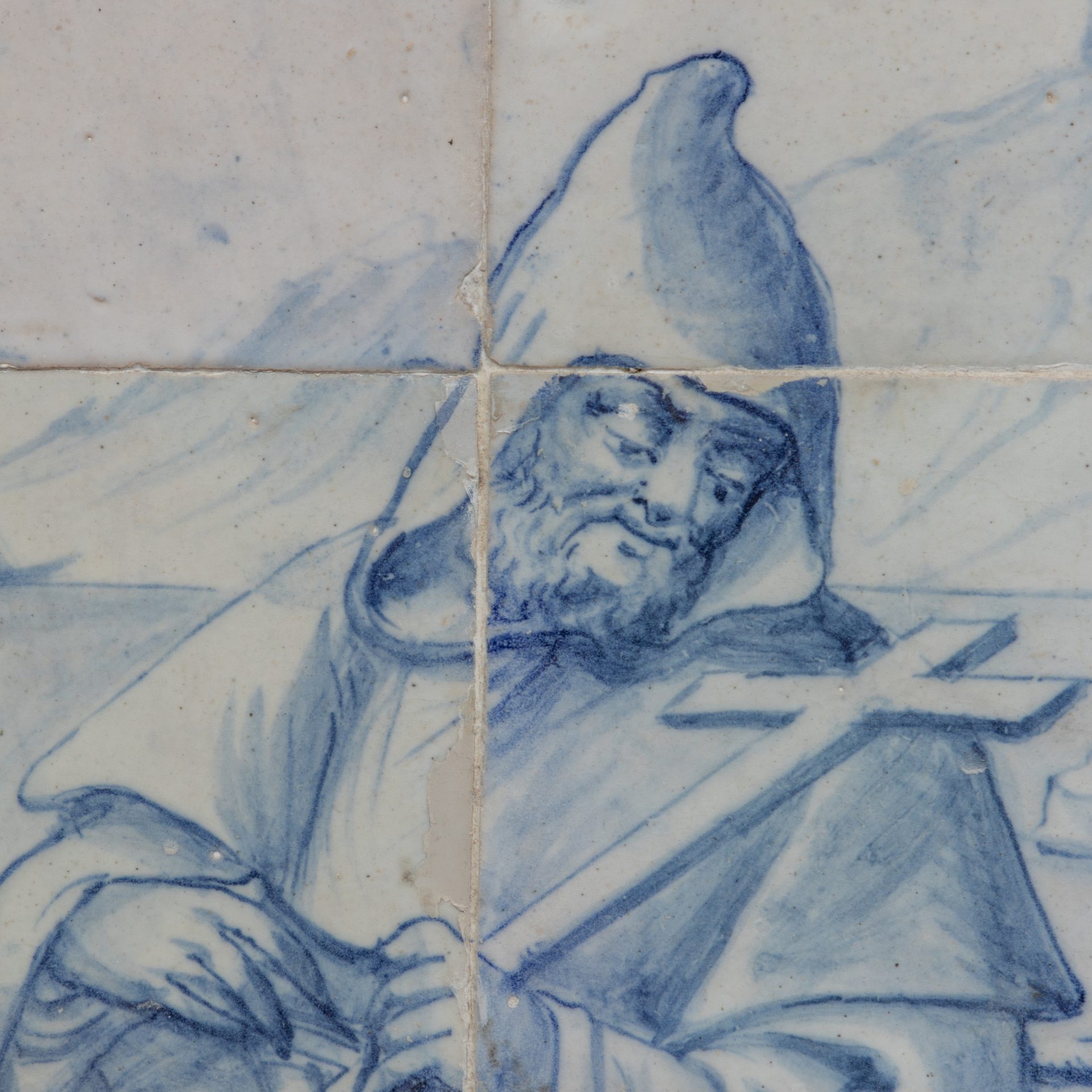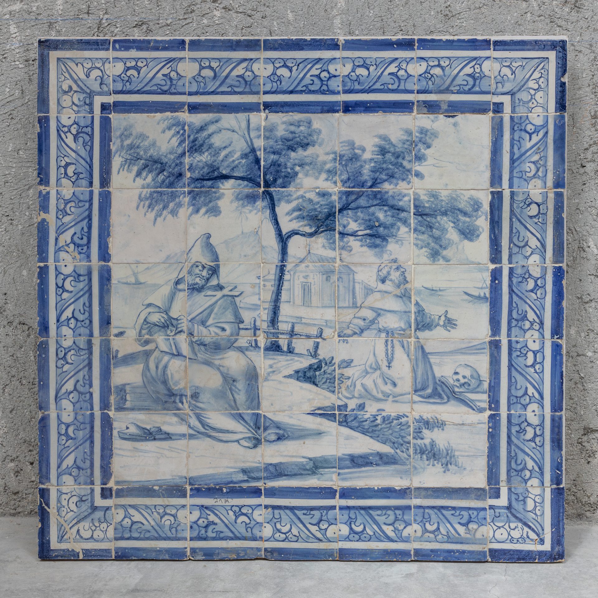 Painel figurativo do século XVIII em azul e branco com a representação de uma cena alegórica de memento Mori, com figuras religiosas em atitude contemplativa, caveira e paisagem ao fundo, enquadradas por cercadura ornamental.