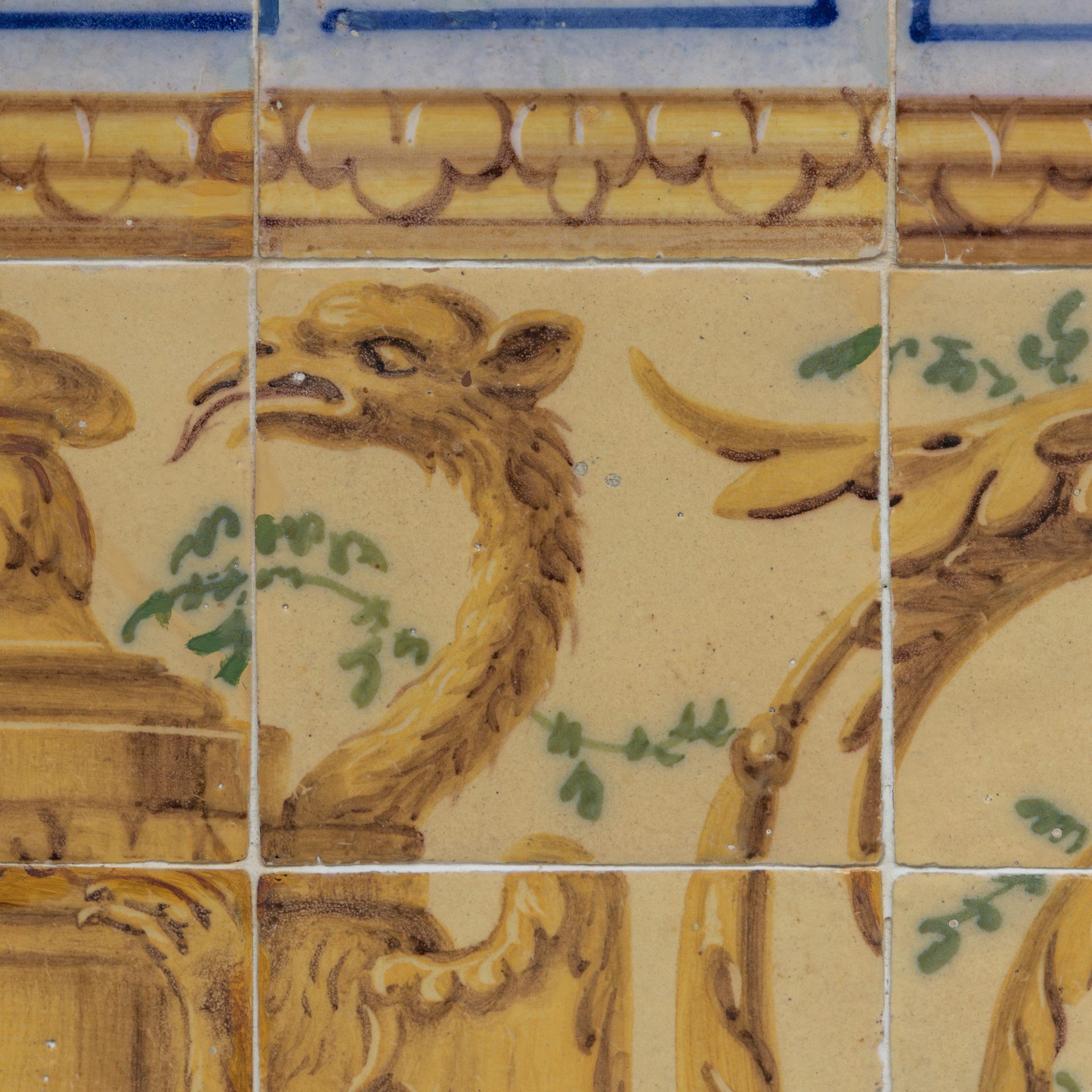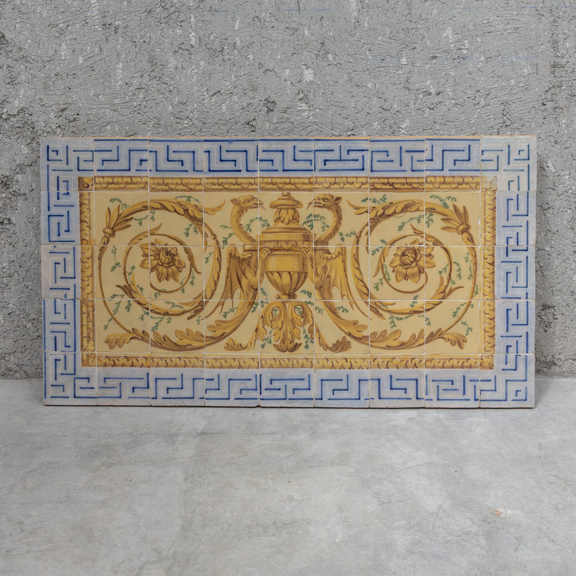 Painel de azulejos do século XVIII/XIX com decoração clássica: motivo central simétrico em tons de amarelo e verde, com ânfora com dragões e elementos vegetais, enquadrado por uma moldura geométrica azul.