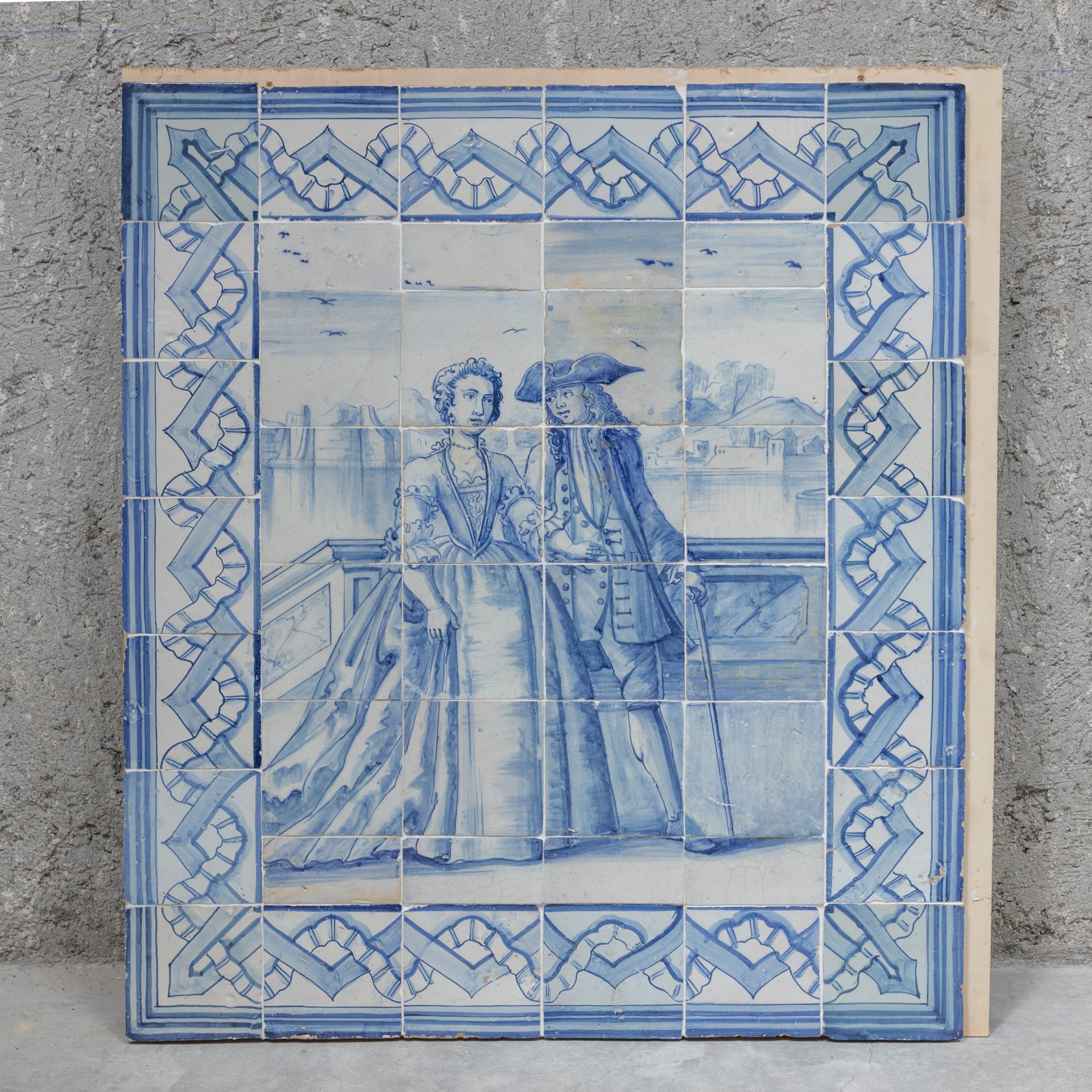 Painel figurativo do século XVIII em azul e branco representando uma cena galante.